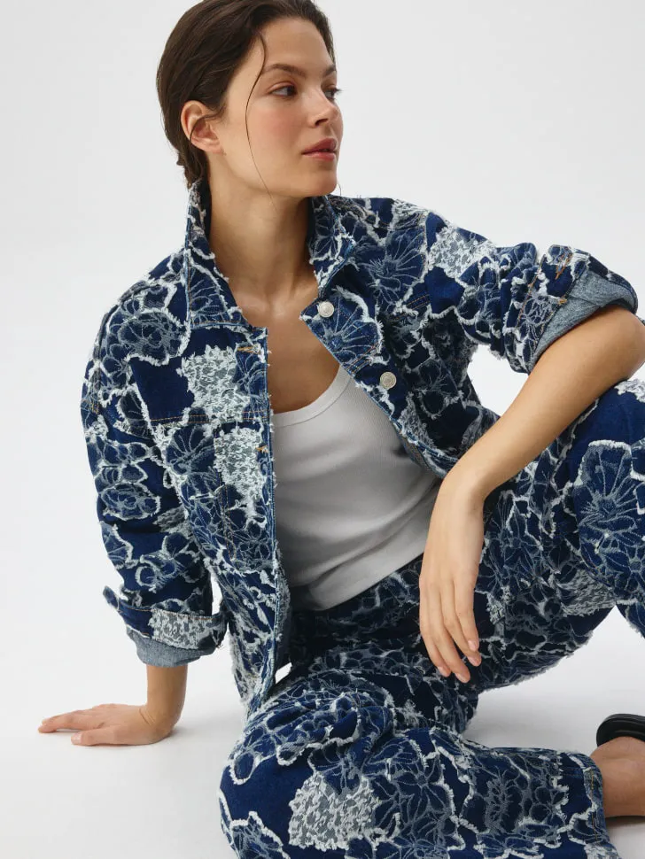 Уникальный цветочный принт, выполненный в нежных тонах синего и белого, придает куртке особый шарм и позволяет легко вписать её в самые разнообразные образы. Носите её с легкими платьями для романтического свидания, с классическими брюками для городского шика или с любимыми джинсами для создания расслабленного, но стильного лука. Будьте в центре внимания с этой модной и универсальной вещью, которая станет жемчужиной вашего весенне-летнего гардероба.