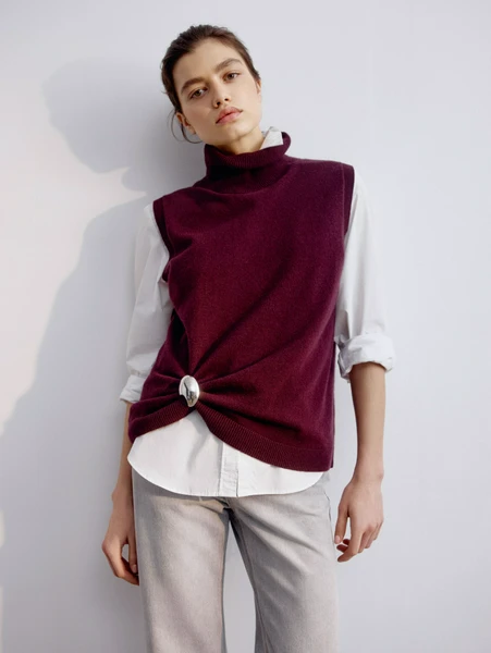 Представляем вам изысканный жилет Sela с высоким воротником, который станет незаменимой частью вашего осенне-зимнего гардероба. Этот жилет изготовлен из 100% натуральной шерсти, обеспечивая непревзойденное тепло и мягкость.