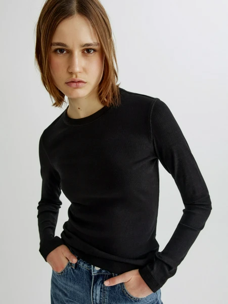 Представляем идеальный лонгслив от Sela – незаменимую базу для вашего гардероба! Этот приталенный лонгслив в нежный рубчик выполнен из мягкого хлопка, обеспечивая максимальный комфорт в течение всего дня. Его универсальный черный цвет и классический крой делают его идеальным выбором для любого образа: от повседневного до более элегантного.