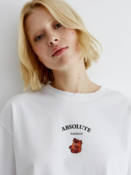 Модель имеет стильный принт с очаровательным персонажем и вдохновляющей надписью «ABSOLUTE HARMONY», что добавляет ей особого шарма. Особенностью дизайна является слегка потертая горловина, придающая изделию актуальный расслабленный вид. Лонгслив прекрасно сочетается как с джинсами для создания непринужденного кэжуал-образа, так и с юбками для более женственного стиля. Выбирайте качество и трендовый дизайн от SELA для своих повседневных комплектов!